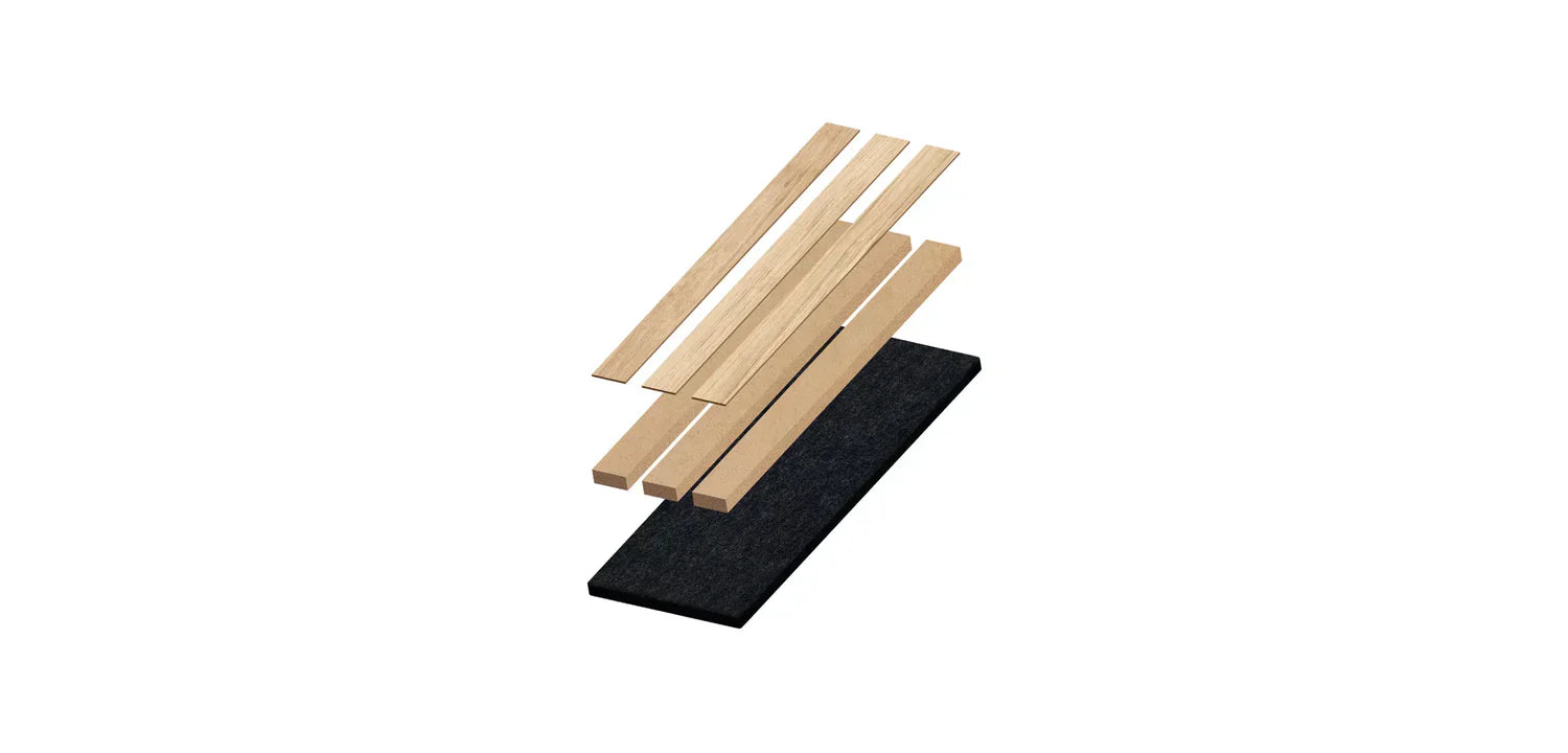 El panel de laminillas Morada combina capas de chapa de madera natural, MDF y fieltro acústico reciclado, proporcionando estética, funcionalidad y sostenibilidad en cada detalle.
